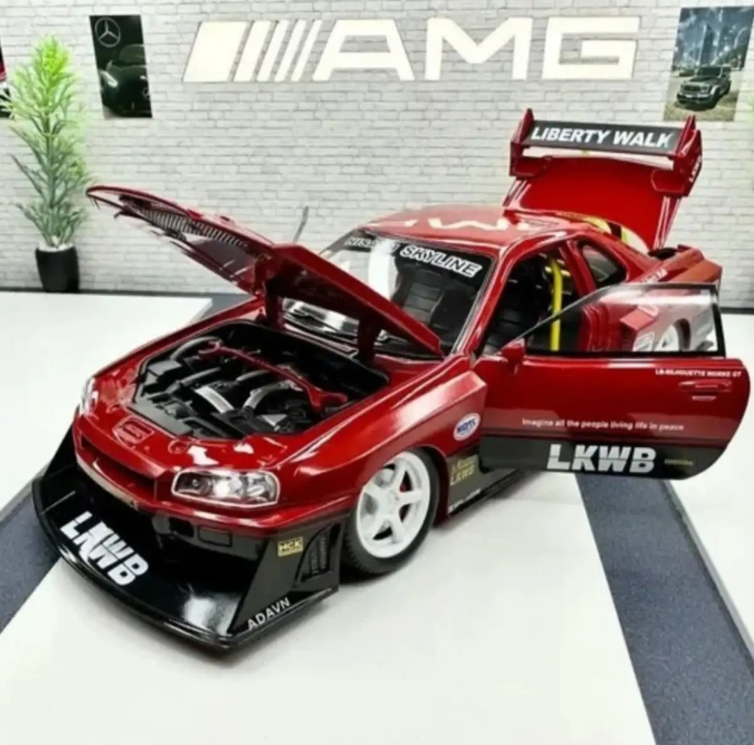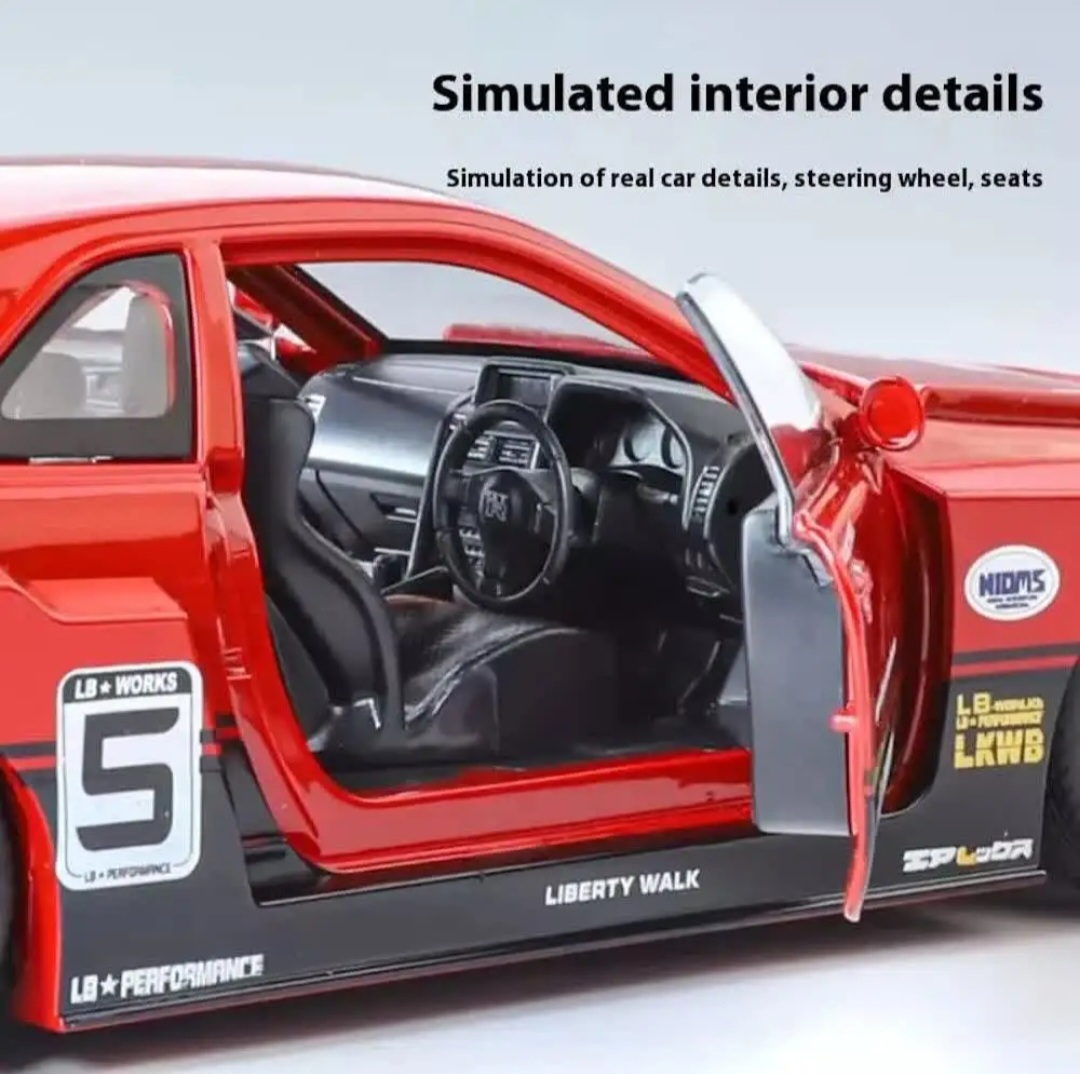 ماکت فلزی نیسان جی تی آر قدیمی با کیت بدنه اسپرت مقیاس 1,24 طول 22 سانتی متر دزدگیر درب و چراغدار - تمام درب باز شو - عقب کش با جزئیات کامل و دقیق