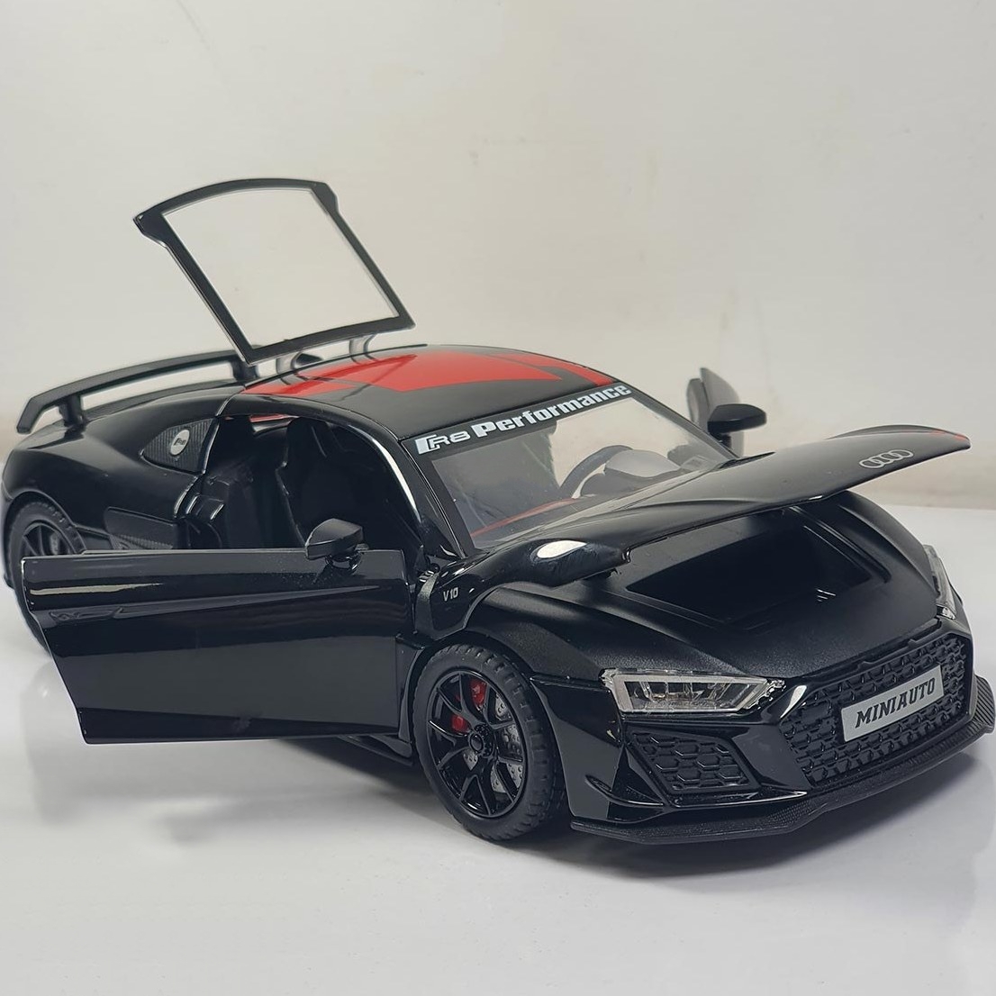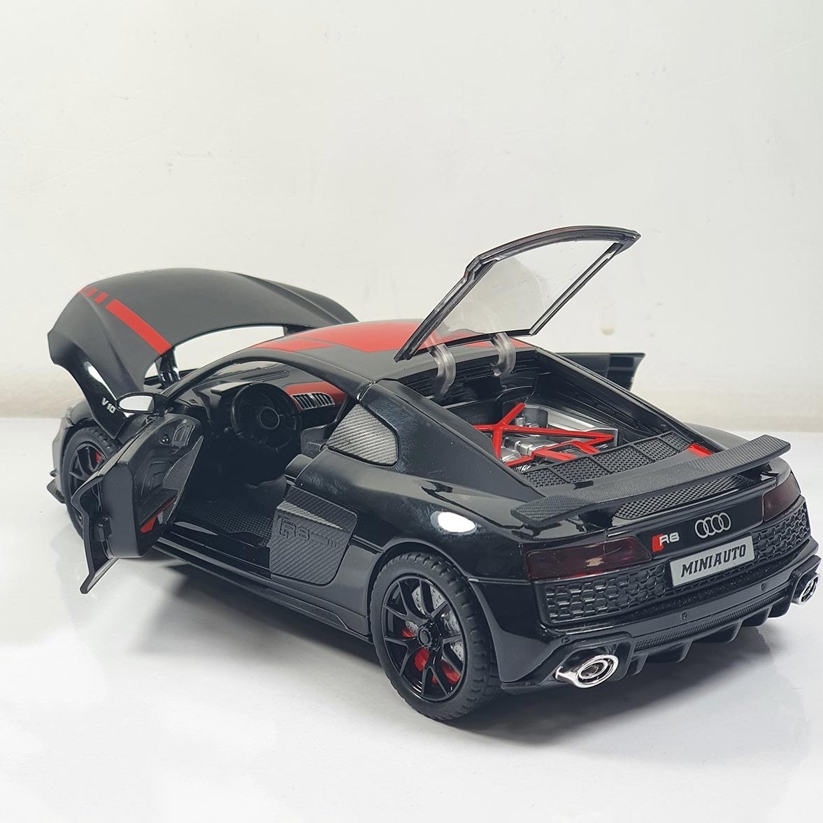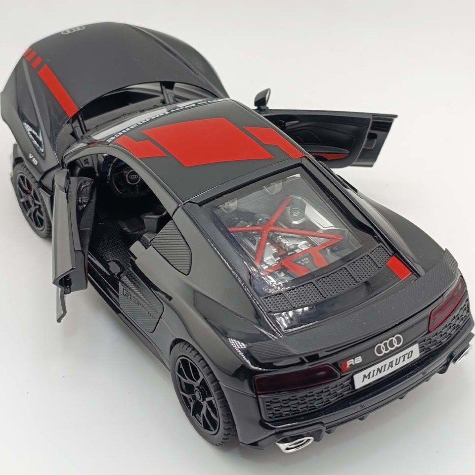 ماکت فلزی آئودی R8 مقیاس 1,24 طول 21 سانتی متر موزیکال و چراغدار - تمام درب باز شو - آینه ها تاشو عقب کش