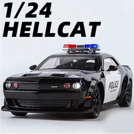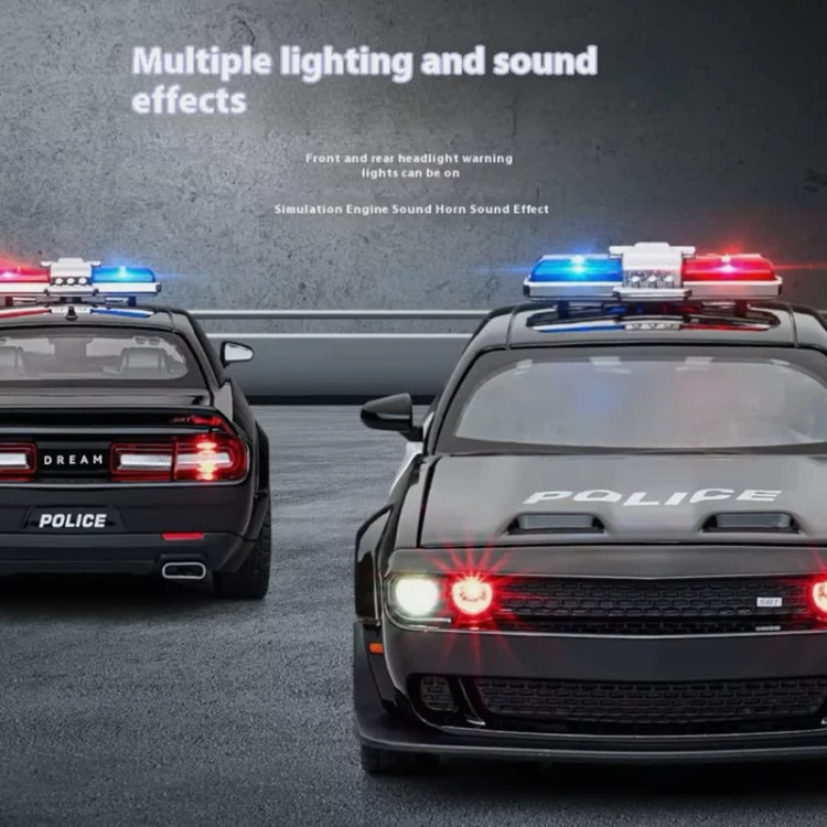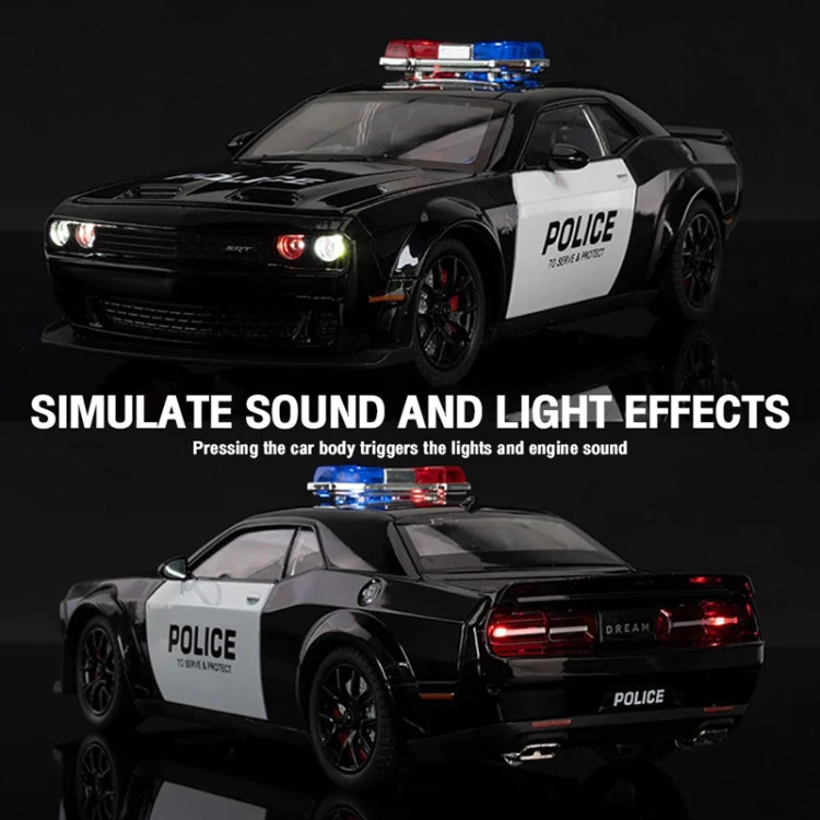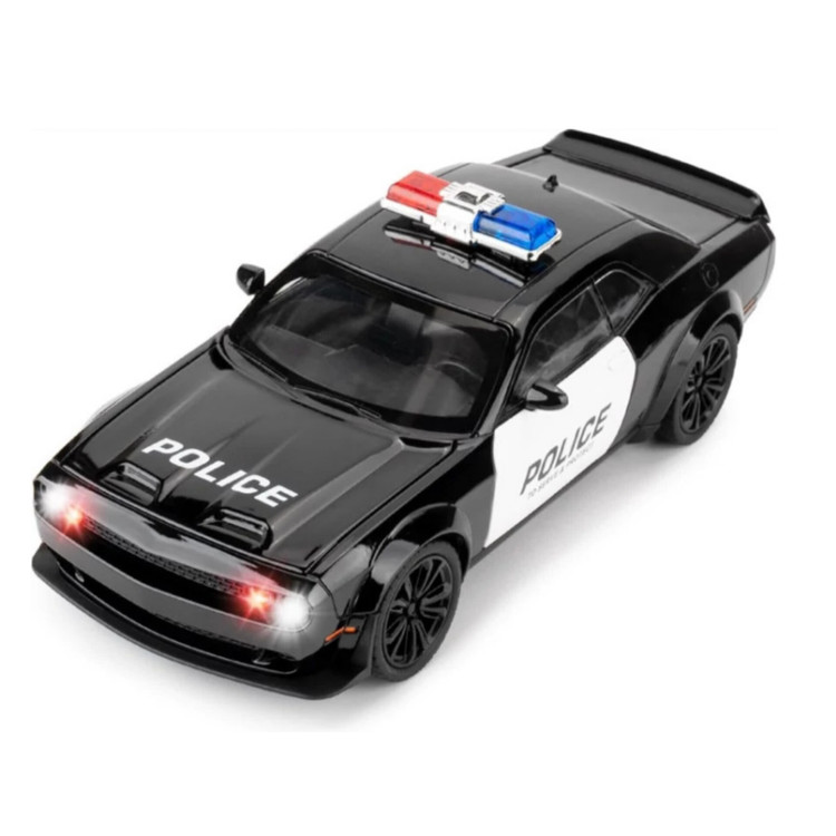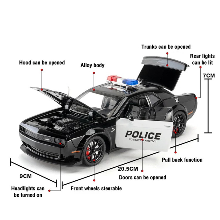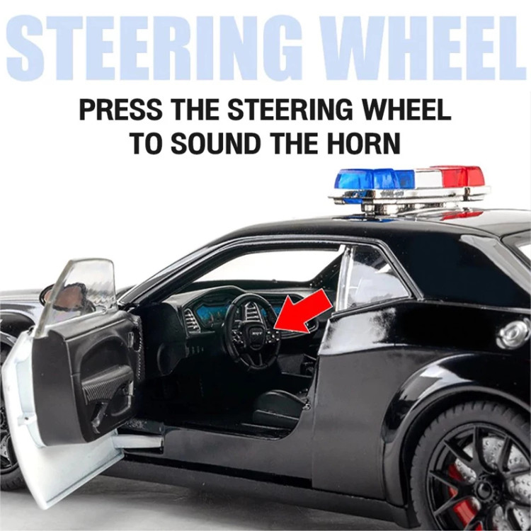 ماکت دوج چلنچر پلیس مقیاس 1,24 فلزی طول 21 سانتی متر تمام درب ها باز شو - دارای چهار مدل آژیر پلیس چرخ ها فرمان پذیر - بوق روی فرمان - چرخ ها فرمان پذیر با قابلیت تنظیم صندلی ها
