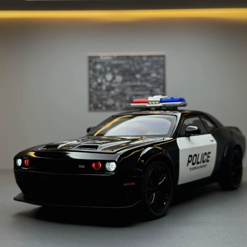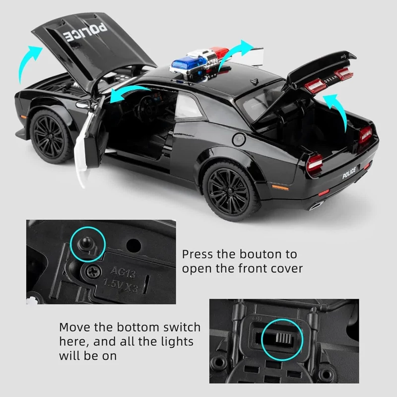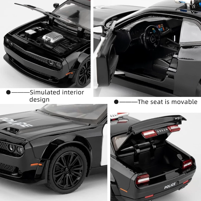 ماکت دوج چلنچر پلیس مقیاس 1,24 فلزی طول 21 سانتی متر تمام درب ها باز شو - دارای چهار مدل آژیر پلیس چرخ ها فرمان پذیر - بوق روی فرمان - چرخ ها فرمان پذیر با قابلیت تنظیم صندلی ها